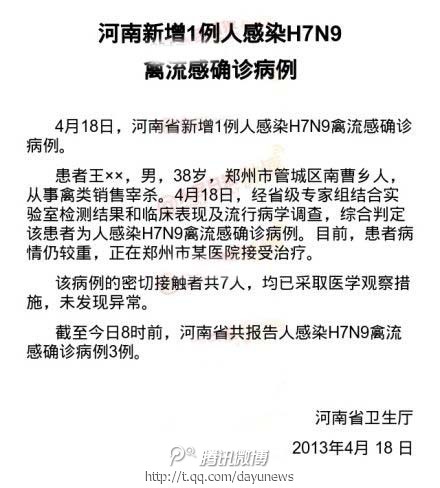 河南新增1例人感染H7N9禽流感病例 全国84例